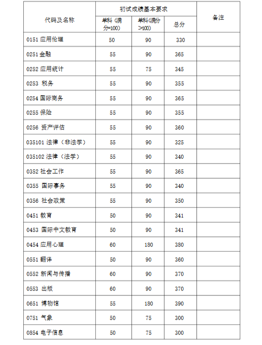 其中面向西藏地区“公共管理人才培养计划”专项,满分100分的单科成绩不低于40分、满分200分的单科成绩不低于90分、总分不低于160分;面向新疆喀什地区医学硕士专项,总分不低于235分,各单科成绩不作要求。