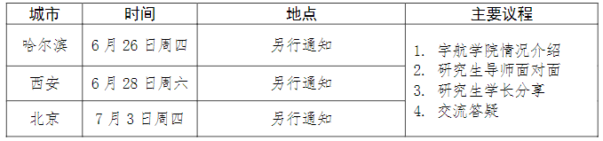 北京航空航天大学宇航学院2025年研究生宣讲会及暑期学校活动通知为促进各高校优秀本科生对北京航空航天大学宇航学院的了解,熟悉宇航学院研究生培养相关政策,兹定于2025年6月26日—7月3日分别在哈尔滨、西安和北京组织召开宣讲会,同时拟定于2025年7月5日以线上形式举办暑期学校活动,欢迎优秀大学生积极报名。