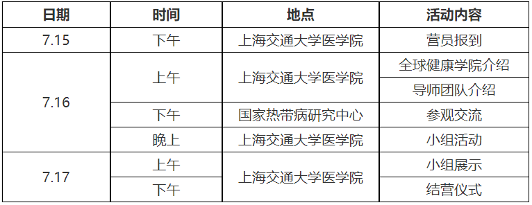 为促进全国各地优秀大学生之间的交流,增加青年学生对全球健康与全健康领域的兴趣,增进学生与学院、学科、导师之间的了解和交流,吸引优秀大学生报考我院,进而促进我国全球健康和全健康学科发展,特举办上海交通大学医学院-国家热带病研究中心全球健康学院2026年研究生招生暨优秀大学生暑期夏令营活动。