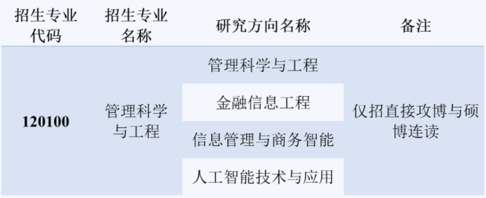我院按管理科学与工程一级学科招生,各研究方向统一培养,仅招收直接攻博与硕博连读项目,招生专业与研究方向详见下表。