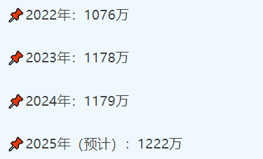 第一,庞大的毕业生基础。从数据来看,2025 年预计将有 1222 万高校毕业生涌入社会。这个庞大的群体,本身就构成了考研 “潜在竞争者” 的巨大蓄水池。