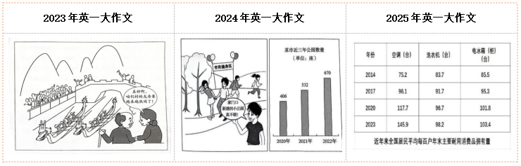 (1)2024考研英语(一)大作文出现了“图画”+“图表”的出题模式,而2025考研的作文题则变成了纯粹的图表作文。