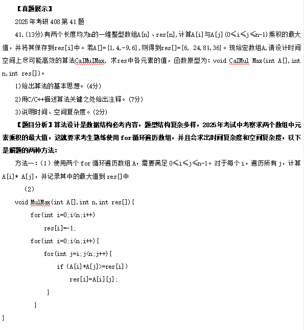 数据结构侧重考查考生对知识点的理解和运用能力。考试内容覆盖线性表、树、图等基本结构及其算法,如要求在时间空间上尽可能高效地求出数组乘积的最大值。题目类型丰富,包括算法设计、复杂度分析等,要求考生不仅掌握理论知识,还能灵活运用数据结构解决实际问题。