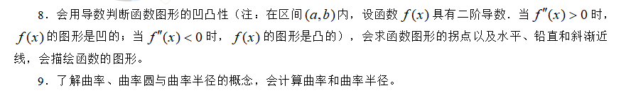 导数和微分的概念 导数的几何意义和物理意义 函数的可导性与连续性之间的关系 平面曲线的切线和法线 导数和微分的四则运算 基本初等函数的导数 复合函数、反函数、隐函数以及参数方程所确定的函数的微分法 高阶导数 一阶微分形式的不变性 微分中值定理 洛必达(L’Hospital)法则 函数单调性的判别 函数的极值 函数图形的凹凸性、拐点及渐近线 函数图形的描绘 函数的最大值与最小值 弧微分 曲率的概念 曲率圆与曲率半径