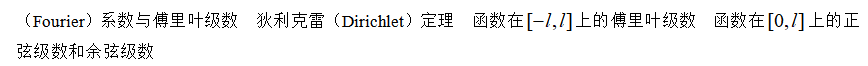 常数项级数的收敛与发散的概念 收敛级数的和的概念 级数的基本性质与收敛的必要条件 几何级数与p级数及其收敛性 正项级数收敛性的判别法 交错级数与莱布尼茨定理 任意项级数的绝对收敛与条件收敛 函数项级数的收敛域与和函数的概念 幂级数及其收敛半径、收敛区间(指开区间)和收敛域 幂级数的和函数 幂级数在其收敛区间内的基本性质 简单幂级数的和函数的求法 初等函数的幂级数展开式 函数的傅里叶