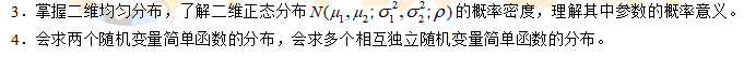 1.理解多维随机变量的概念,理解多维随机变量的分布的概念和性质,理解二维离散型随机变量的概率分布、边缘分布和条件分布,理解二维连续型随机变量的概率密度、边缘密度和条件密度,会求与二维随机变量相关事件的概率。