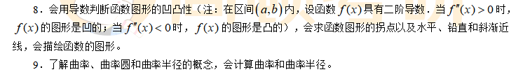导数和微分的概念 导数的几何意义和物理意义 函数的可导性与连续性之间的关系 平面曲线的切线和法线 导数和微分的四则运算 基本初等函数的导数 复合函数、反函数、隐函数以及参数方程所确定的函数的微分法 高阶导数 一阶微分形式的不变性 微分中值定理 洛必达(L'Hospital)法则 函数单调性的判别 函数的极值 函数图形的凹凸性、拐点及渐近线 函数图形的描绘 函数的最大值与最小值 弧微分 曲率的概念 曲率圆与曲率半径