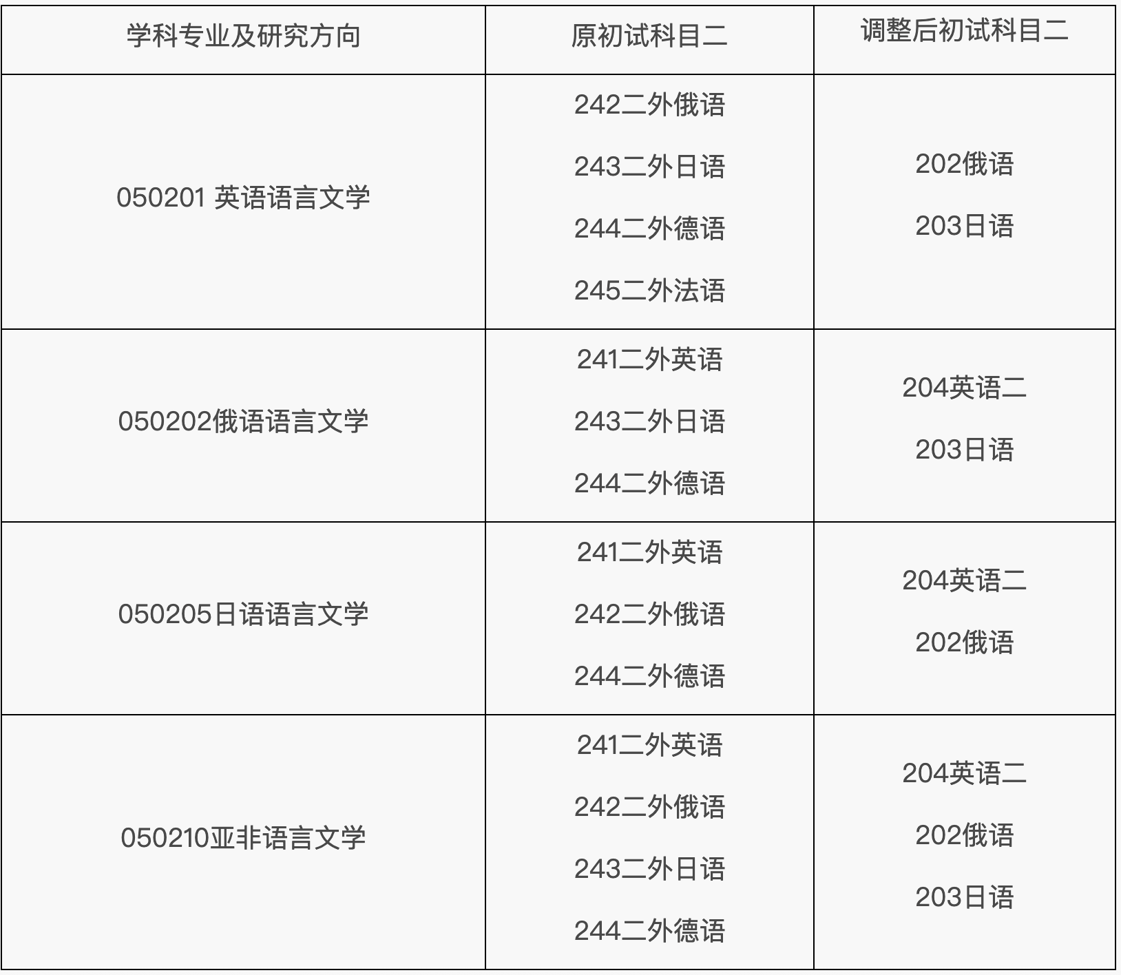 自2027年起,英语语言文学、俄语语言文学、日语语言文学、亚非语言文学专业初试科目二由自命题科目调整为全国统一命题科目。具体情况见下表: